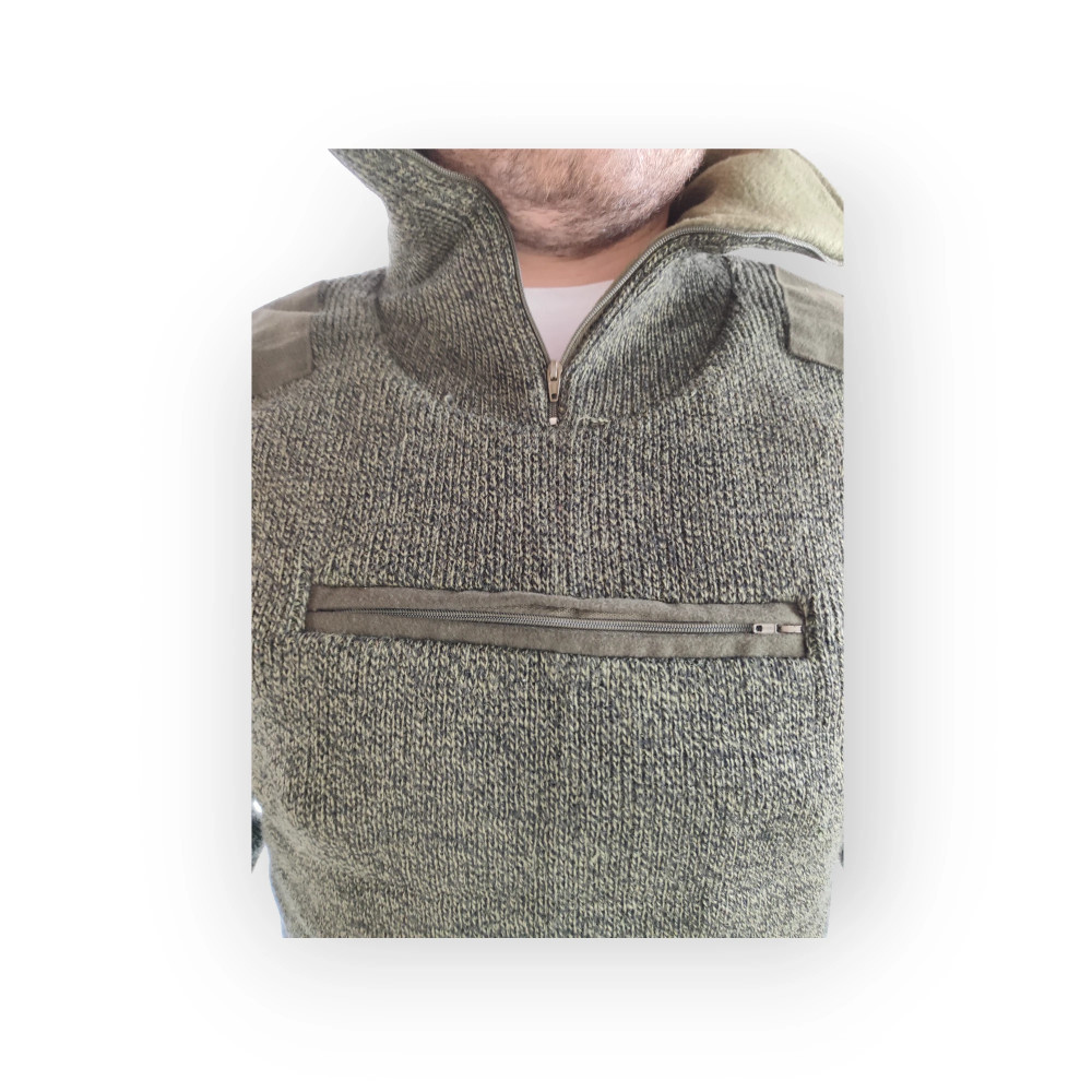 Magasított nyakkal, mell részen zsebbel ellátott kötött vadászpulover polár béléssel, zippzáras zsebbel, vállbetétekkel.