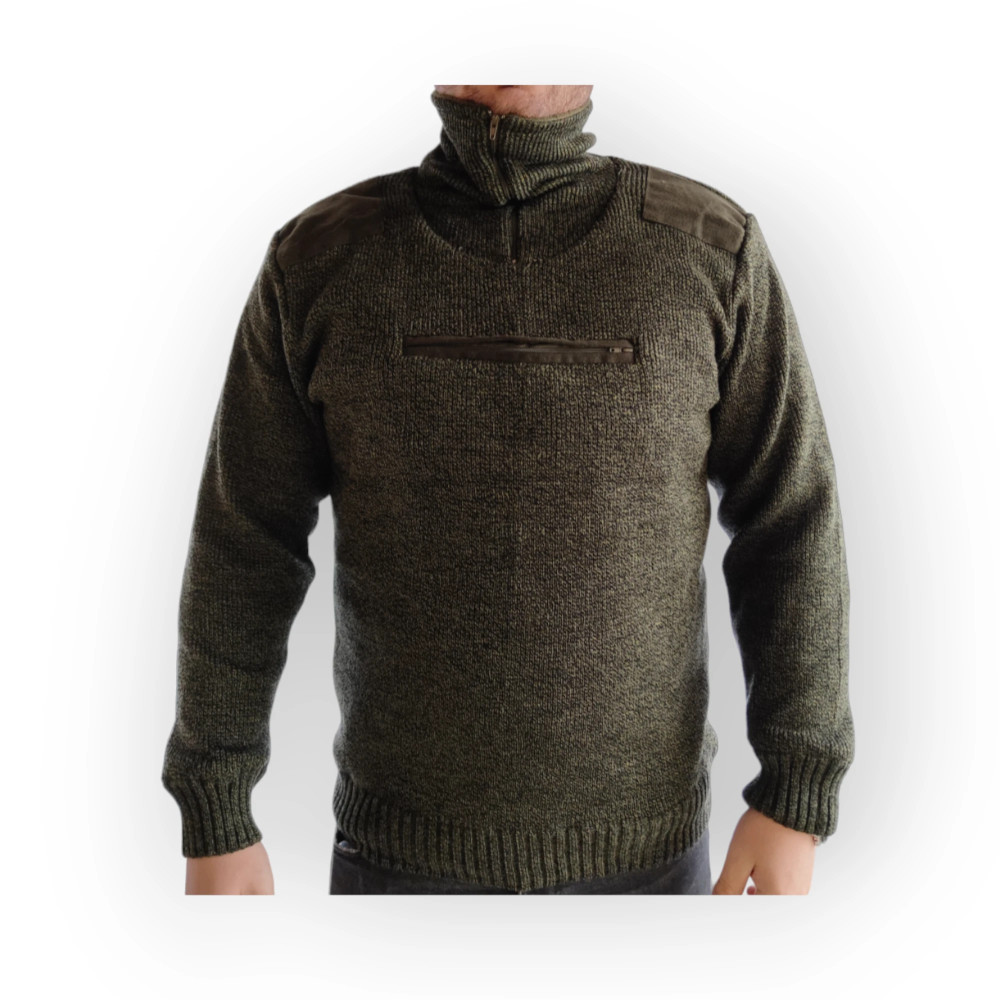 Magasított nyakkal, mell részen zsebbel ellátott kötött vadászpulover polár béléssel, zippzáras zsebbel, vállbetétekkel.